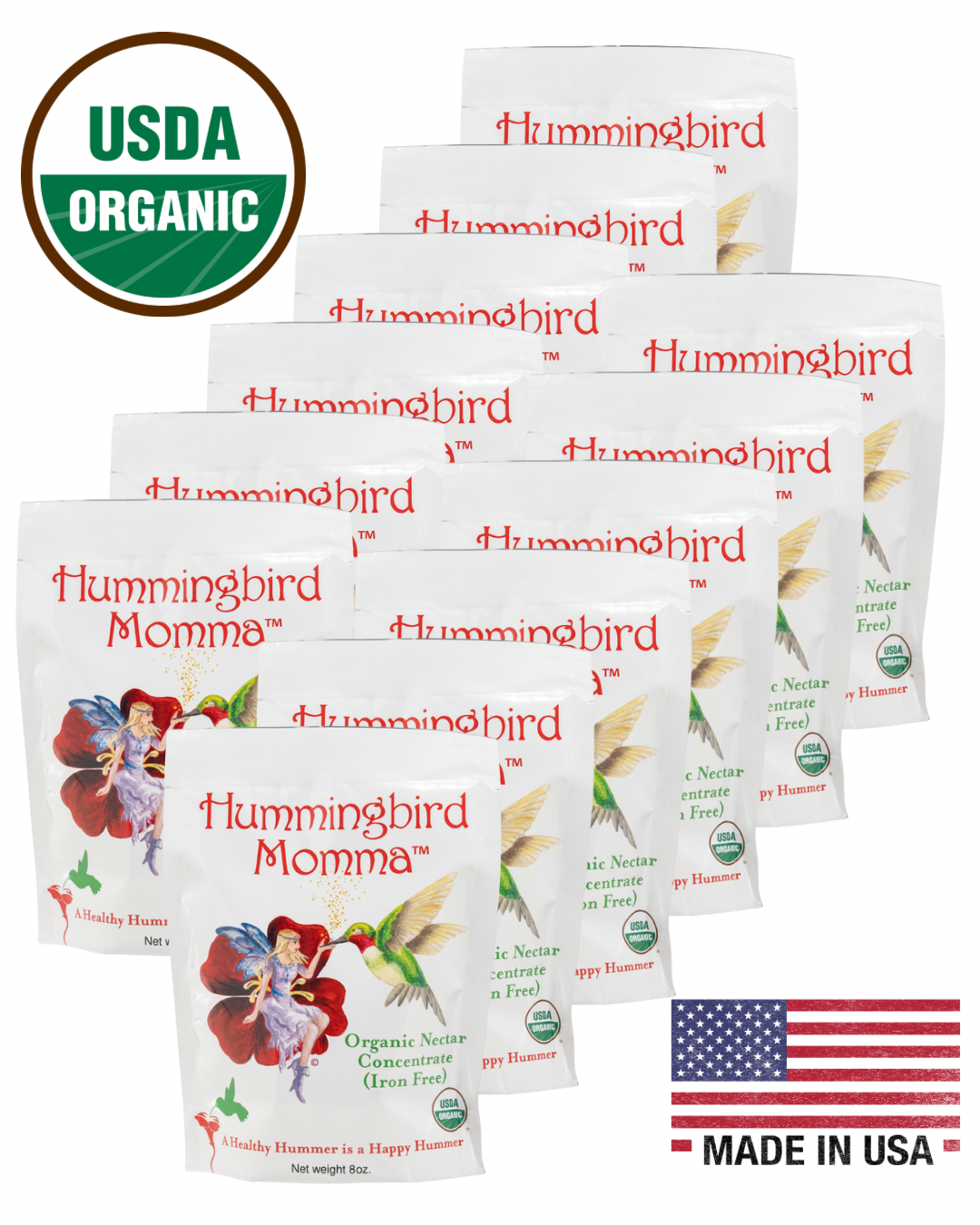 Hummingbird Momma's Organic Hummingbird Food is the only Iron-Free, USDA-Certified Organic Hummingbird nectar available within this market and category. Simplify backyard feeding while providing essential nourishment with our 12-pack of pure, certified organic nectar, delivering clean and easy nourishment without harmful additives like preservatives, iron, or dyes. Our Mission and final goal is to provide our customer base with a healthy Hummingbird-Safe nectar you can count on.