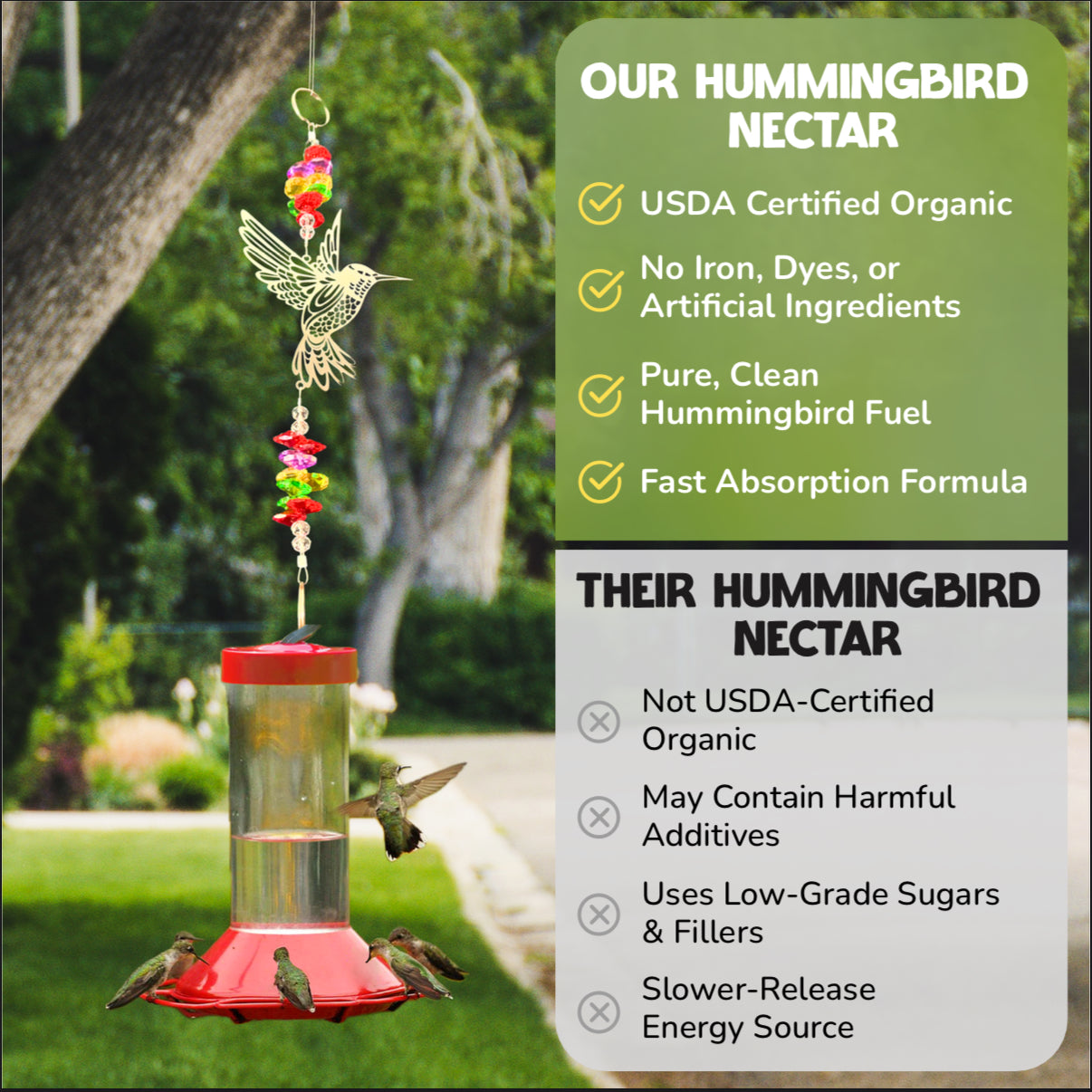 Our organic nectar is lovingly prepared to provide the essential energy hummingbirds need to thrive, without the unnecessary additives. Plus, it can be refrigerated for up to 10 days, guaranteeing a continuous supply without compromising freshness or quality. Our USDA-Certified Organic Nectar is not a complex formulation, nor does it contain preservatives and other questionable additives that may potentially cause allergic reactions, behavioral changes, and long-term health issues to our Hummingbirds. Go Organic!