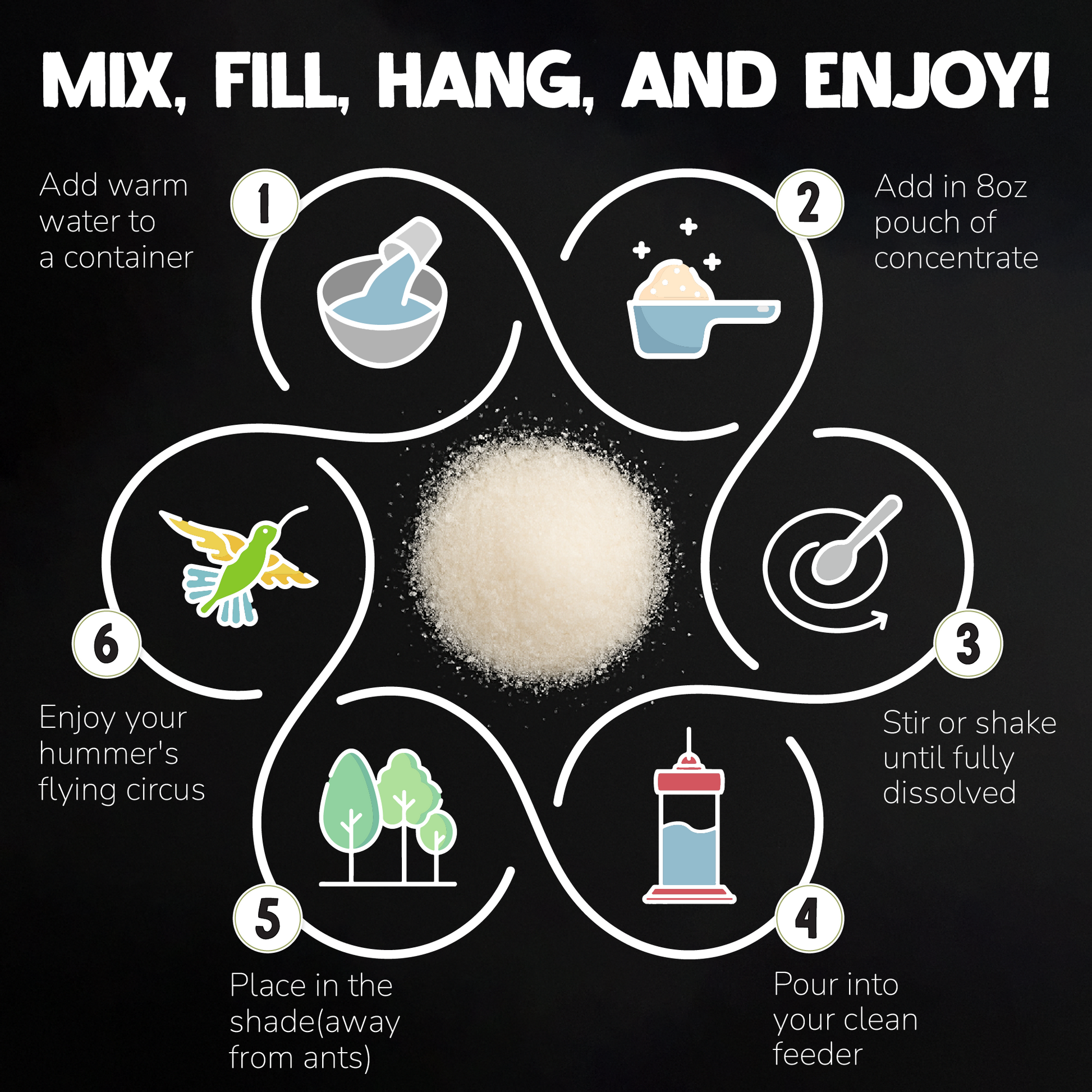 With our bulk pack, you can trust that you're stocking up on the best choice for your backyard buddies. Simply clean your feeder with warm water (do not use soap or chemicals), mix each 8-ounce bag of our organic nectar in four cups of warm water, and allow the liquid to cool—no boiling required.